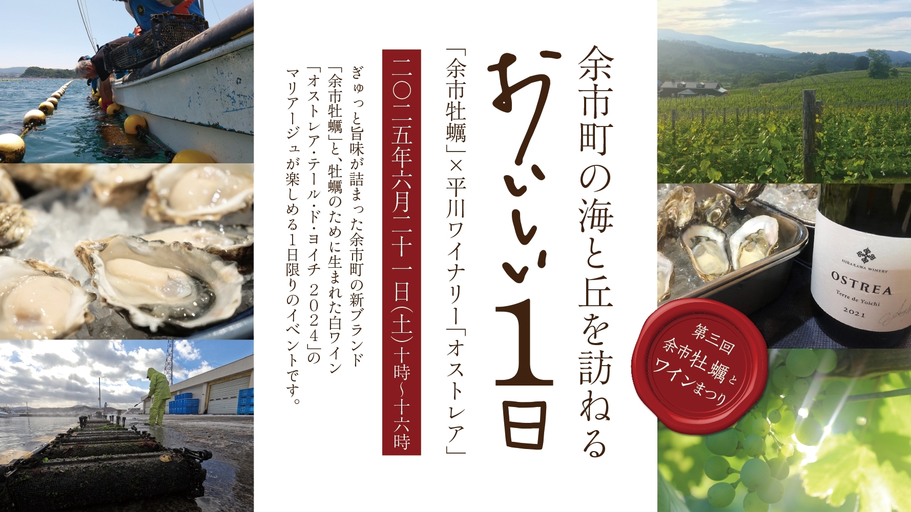 ぎゅっと旨味が詰まった余市町の新ブランド「余市牡蠣」と、牡蠣のために生まれた白ワイン「オストレア・テール・ド・ヨイチ2025」のマリアージュが楽しめる1日限りのイベントです。